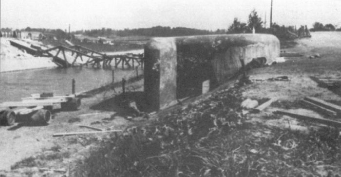 Im Hintergrund sieht man die Brücke von Canne, oder Kanne, welche die Belgier noch zu zerstören vermochten, ehe die vorrückenden deutschen Truppen sie überqueren konnten. Andere, nahegelegene Brücken konnten sie hingegen nicht mehr sprengen. Im Vordergrund ist eine Beobachtungs-Kasematte zu erkennen.
