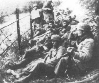 Belgische Kriegsgefangene bei Eben-Emael mit ihren deutschen Wachen vor dem Abmarsch in ein Gefangenenlager. Es war für Belgien sehr demütigend, daß die mächtige Festung, von der man annahm, sie könne unbegrenzt lange Zeit Widerstand leisten, von den Deutschen mittels eines Überraschungsangriffs unter Einsatz unerwarteter Waffen - Segelflugzeuge zum Transport der Soldaten sowie Hohlladungsgranaten - binnen weniger Stunden eingenommen wurde. Hitler hat diesen Angriff selbst entworfen, doch seine Generäle schafften es, daß dem ehemaligen Gefreiten des Ersten Weltkriegs nach dem erfolgreichen Handstreich jeglicher Kredit für seine Verdienste um die Eroberung des Forts verweigert wurde.