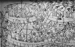 1: Seeschlachtszenen zwischen Ägyptern (Schiffe mit Löwenköpfen) und den Nord-