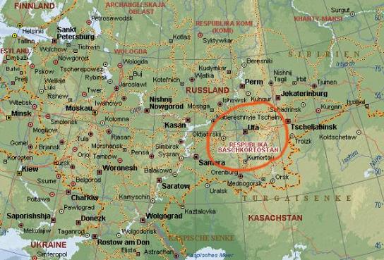 południowych krańcach Uralu, dookoła miasta Ufa ( czerwono zakreślony obszar).