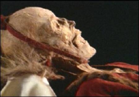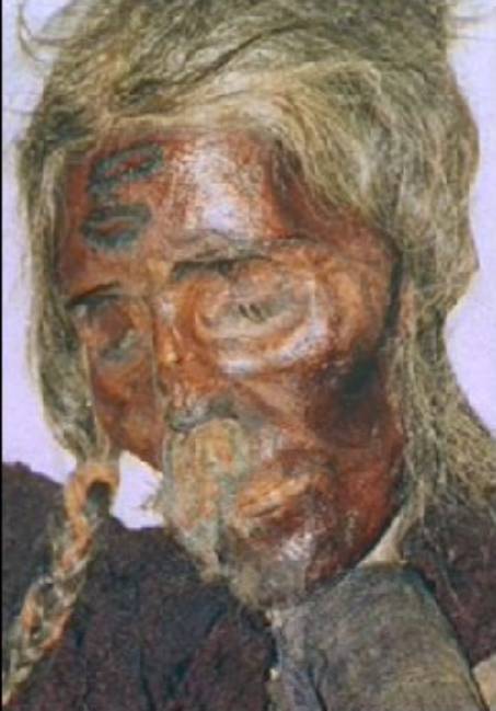 Mumia (2000 p.n.Chr.) kobiety z Uruczi, włosy blond, pociągła twarz. Rasa północno- europejska