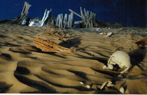 Walające się, po pustynnym piachu wybielone od słońca ludzkie szczątki
